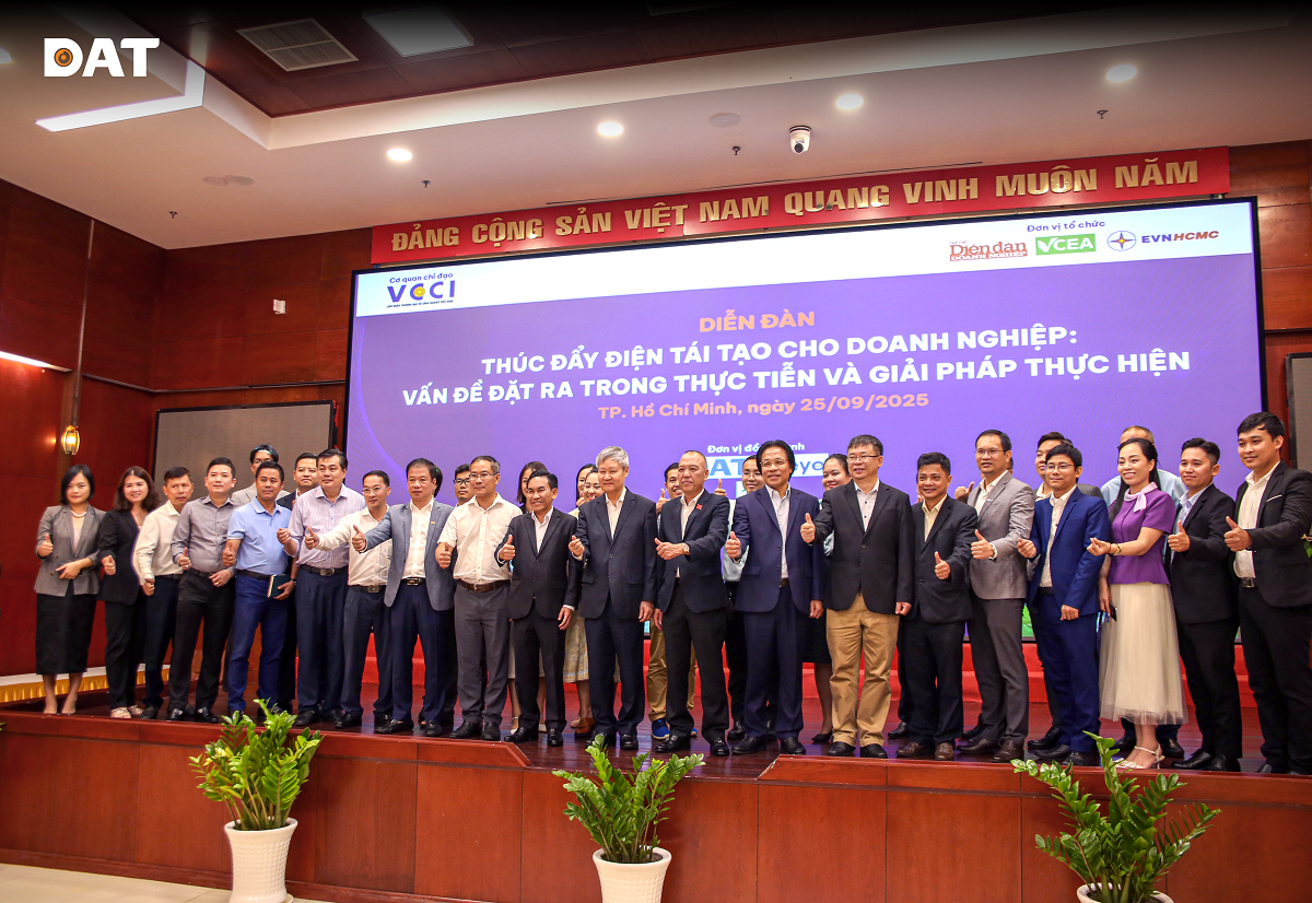 Chiều ngày 25/09/2025, dưới sự chỉ đạo của Liên đoàn Thương mại và Công nghiệp Việt Nam (VCCI), Tạp chí Diễn đàn Doanh nghiệp phối hợp với Hiệp hội Năng lượng sạch Việt Nam Văn phòng đại diện tại TP HCM, Viện Nghiên cứu ứng dụng Năng lượng thông minh (iSEAR) và Tổng Công ty Điện lực TP. HCM tổ chức Diễn đàn “Thúc đẩy điện tái tạo cho doanh nghiệp: Vấn đề đặt ra trong thực tiễn và giải pháp thực hiện”, tại TP. HCM. DAT Group vinh dự khi được mời tham dự sự kiện tầm vóc này.