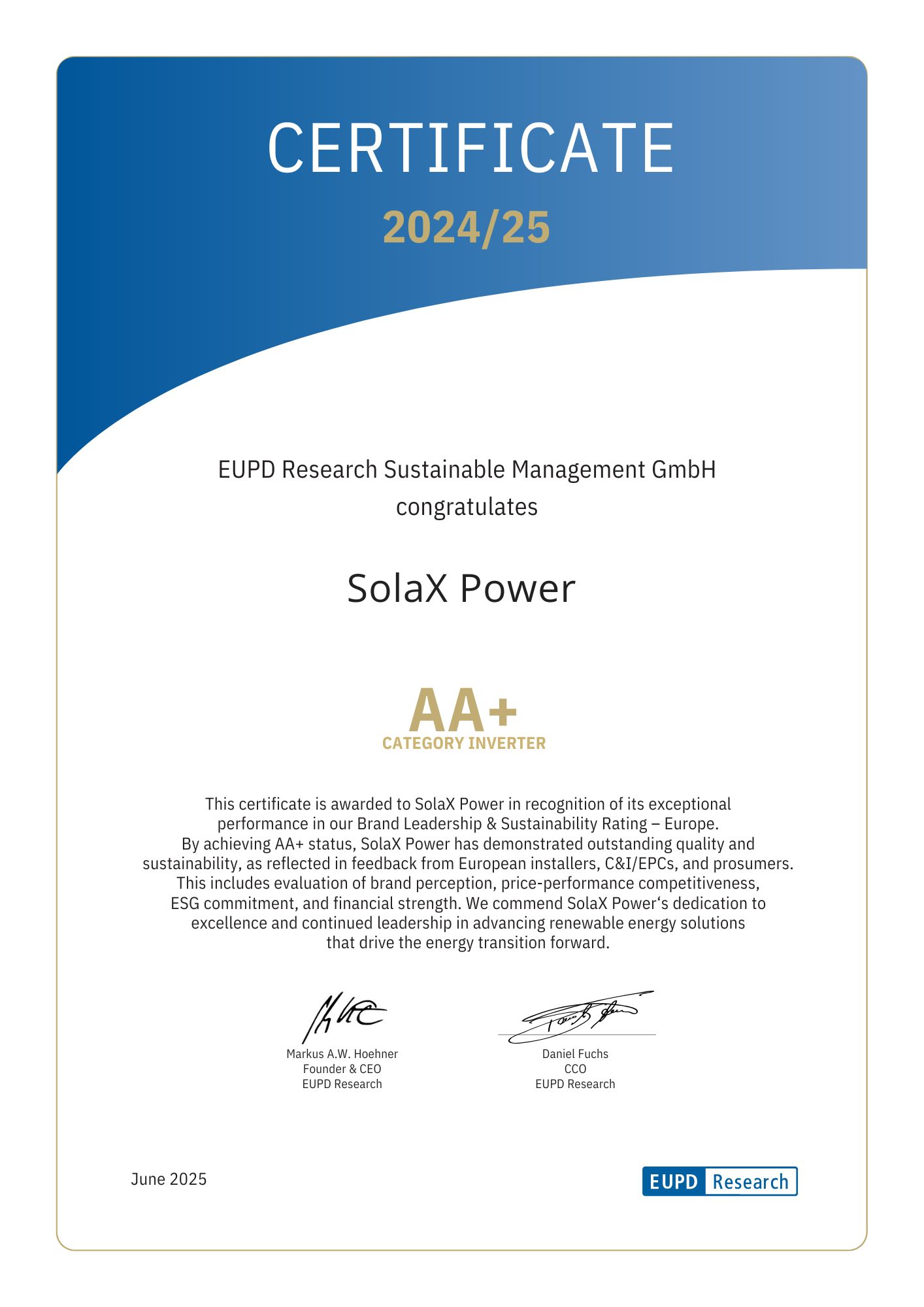 Với 30% lực lượng lao động dành riêng cho nghiên cứu và phát triển (R&D), công ty đã triển khai 1,4 triệu hệ thống lưu trữ năng lượng dân dụng tại hơn 110 quốc gia, nằm trong top 3 thế giới trong lĩnh vực này. Tính đến cuối năm 2024, SolaX sở hữu 338 bằng sáng chế và đạt hơn 1.100 chứng nhận trên toàn cầu, khẳng định sự xuất sắc về mặt kỹ thuật. Cam kết đổi mới và các giải pháp lấy khách hàng làm trọng tâm, SolaX tiếp tục mở rộng tầm ảnh hưởng toàn cầu thông qua các sản phẩm và dịch vụ đáng tin cậy.